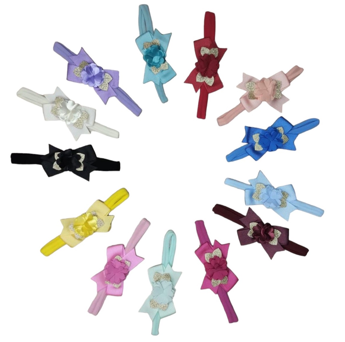 * Faixa de cabelo bebê na meia de seda, com laço em gorgurão e aplique de flor em cetim.